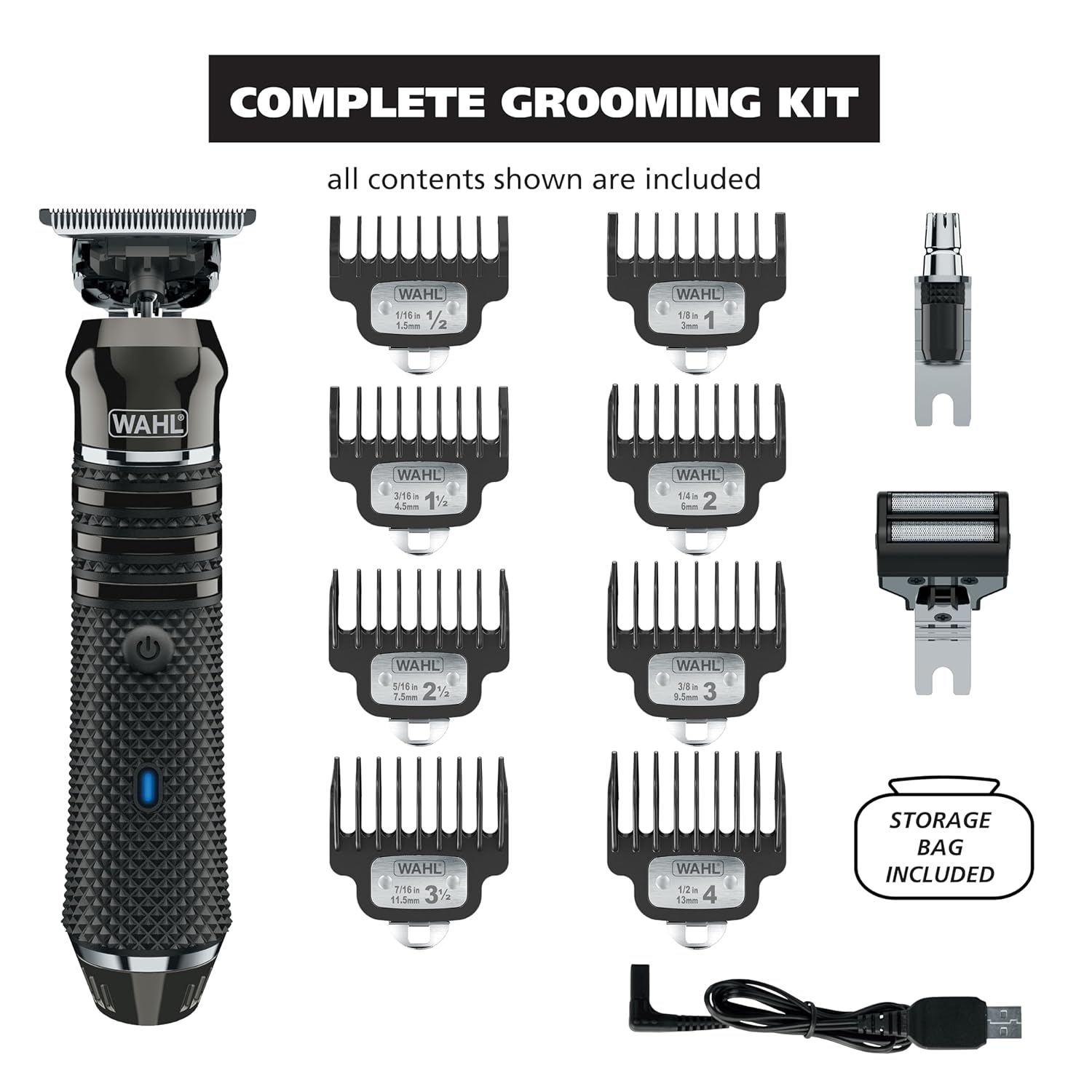 Wahl USA’s Pro Series High Visibility Skeleton Extreme Visibility Beard Trimmer for men is a multi-purpose grooming solution tailored for beards, touch-ups, body grooming, meticulous detailing, and shaving. This kit’s remarkable 360 degree blade design provides extreme visibility of the trimming area, ensuring precise, clean cuts every time. This Wahl beard trimmer showcases our innovative Forever Blade, with a black diamond-hard carbon coating that provides a smoother and cooler cutting experience. The near zero gap blade design (.2mm) cuts 4x closer compared to Wahl’s 1st generation standard trimmer blades and some competition. In addition to the close cutting trimmer blade, this kit also includes a rinseable rotary ear & nose hair trimmer for hygienic trimming of ear and nose hairs, as well as a close shaving dual foil shaver head. The heads have never been quicker or easier to change than with the new on/off thumb screw design. Simply rotate a notch to loosen, attach a new head and rotate to tighten. Whether you’re at the sink or in the shower, this wet/dry trimmer is waterproof, simplifying the cleaning and grooming process. With its rechargeable lithium-ion battery, enjoy up to 2 hours of uninterrupted runtime on a full charge. It also features a battery charging indicator light: blinking lets you know it is charging and a solid light lets you know that it is fully charged. If you hold down the power button for 5 seconds, you can activate and deactivate the trimmers travel lock, making sure the trimmer will not power on accidently during travel. Also included in this kit are 8 individual premium guide combs ranging in cutting sizes from 1/16” to 1/2″, cleaning brush, blade oil, mustache comb, premium handle storage case, USB charge cable, blade guard, and instruction booklet. Note: We recommend using the included cleaning brush to maintain the blades and apply oil to them at least every other trim. Also, when storing the trimmer, always unplug the charging cord from the trimmer when not in use. Rest assured, each mens beard trimmer kit is thoroughly tested for cutting performance before packaging, ensuring the highest standards of quality. While we make every effort to clean the product and remove any testing particles, it is possible that a few may remain. However, these particles are not hair and can be easily wiped off.